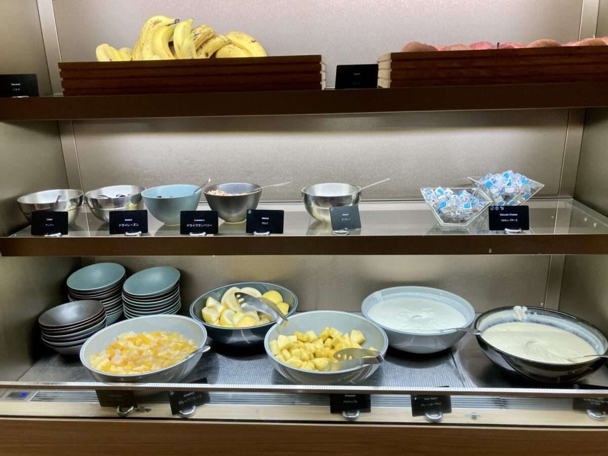 デザートはヨーグルトとフルーツカクテルとバナナとリンゴ