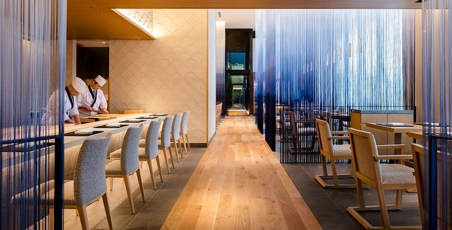 席数:14席 鉄板焼きカウンター12席 寿司カウンター8席、天ぷらカウンター8席
